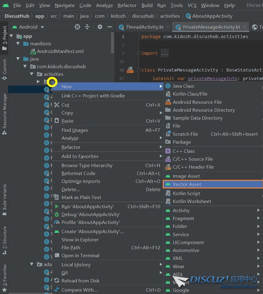 使用Android Studio導(dǎo)入在項(xiàng)目框中任一地方點(diǎn)擊右鍵,呼出對(duì)話框。如果是位圖SVG文件,選擇New -> Vector Asset,如果是PNG、JPG資源文件選擇New -> Image Asset。