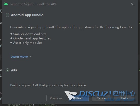 生成應(yīng)用在導(dǎo)航欄中選擇Build->Generate Signed Bundle or APK,打開(kāi)選中的框