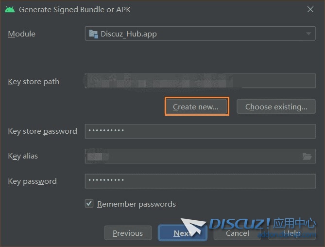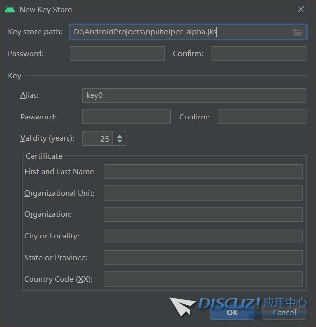 當(dāng)你首次生成安裝文件時(shí),你需要?jiǎng)?chuàng)建一個(gè)密鑰庫(kù)(keystore)對(duì)安裝包進(jìn)行加密,并驗(yàn)證你的身份。如果你之前有密鑰庫(kù),你可以選擇Choose exisiting以選擇密鑰庫(kù)。