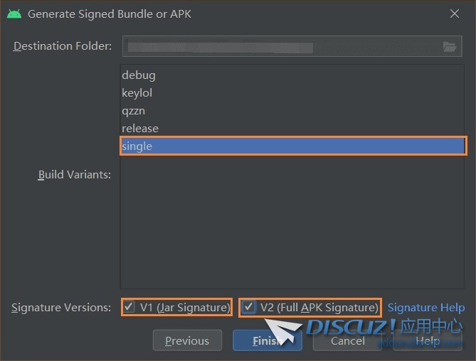 選擇構(gòu)建類(lèi)型請(qǐng)選擇single,構(gòu)建專(zhuān)屬于您論壇的應(yīng)用。建議同時(shí)選擇上簽名版本v1和v2。點(diǎn)擊finish開(kāi)始生成安裝包apk。