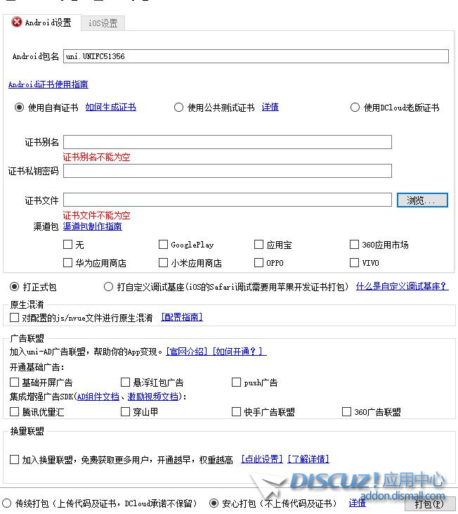 點擊manifest.json 文件獲取APPID,填寫名稱描述,設置APP圖標和啟動頁。 設置好后點擊:發行-云打包。 配置安卓證書后打包即可。 安卓證書在線制作:http://www.applicationloader.net/appuploader/keystore.php(剛申請完證書需要等幾分鐘才可以用!) 第三方登錄最好關了因為不在小云平臺應該無法使用。 找到板塊全選否則APP里就一個板塊。(選擇完后重啟APP就可以看到。) 短信驗證注冊本人沒試過所以關了。 本人制作完成后的樣子。 本人技術有限不知道為什么不能發帖回帖,如果有人會改可以試試。 |