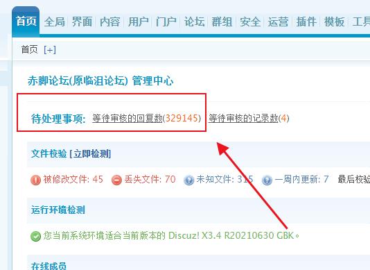 論壇升級(jí)到“Discuz! X3.4 R20210630”后,無(wú)意中發(fā)現(xiàn)多了一個(gè)“內(nèi)容重新審核”功能【上圖】,真是好奇害死貓,只點(diǎn)了個(gè)“主題/帖子標(biāo)題及內(nèi)容重新審核”,結(jié)果出現(xiàn)3萬(wàn)多個(gè)等待審核的主題數(shù),32萬(wàn)多等待審核的回復(fù)數(shù),4萬(wàn)多等待審核的記錄數(shù)【見圖】: