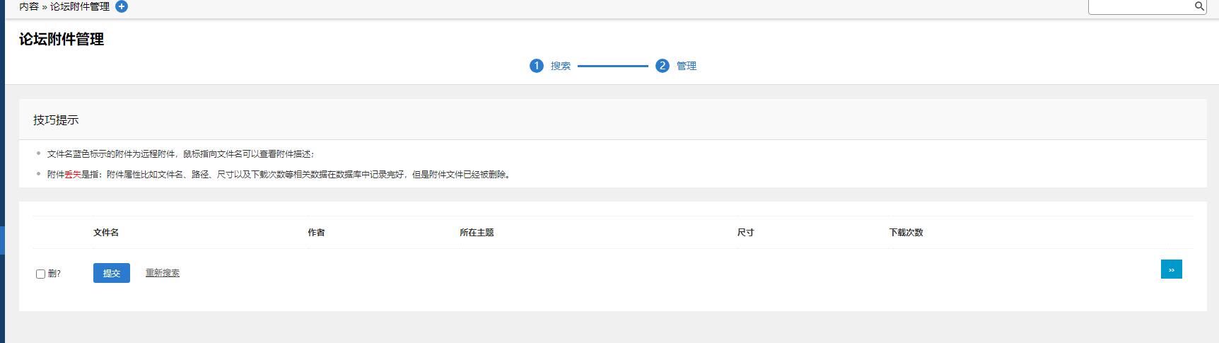 [新問(wèn)題] 后臺(tái)論壇附件管理-只搜索記錄存在但文件缺失的附件,條數(shù)不足一頁(yè)但是也有翻頁(yè) |