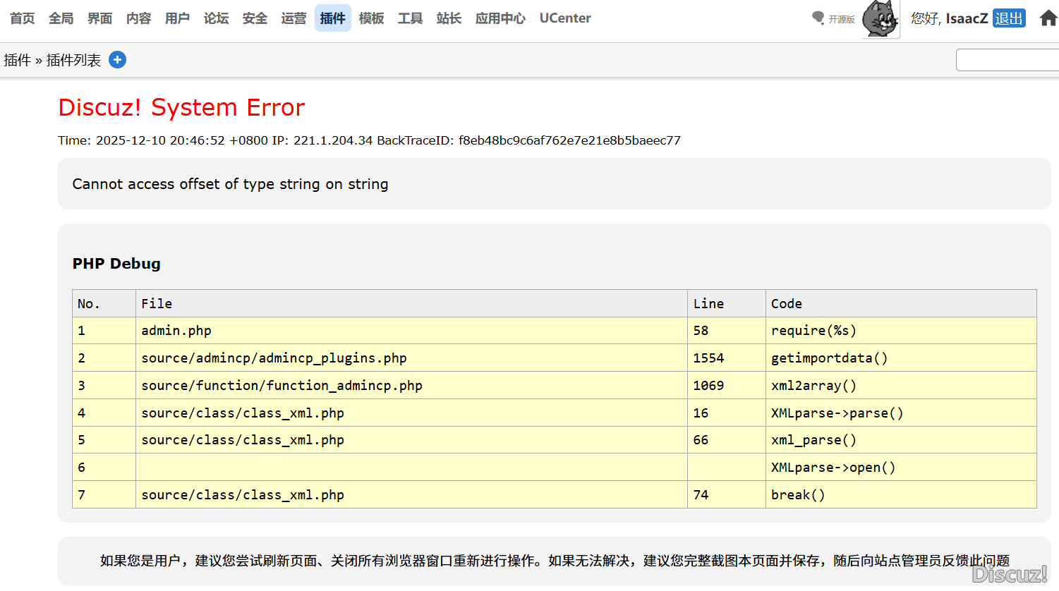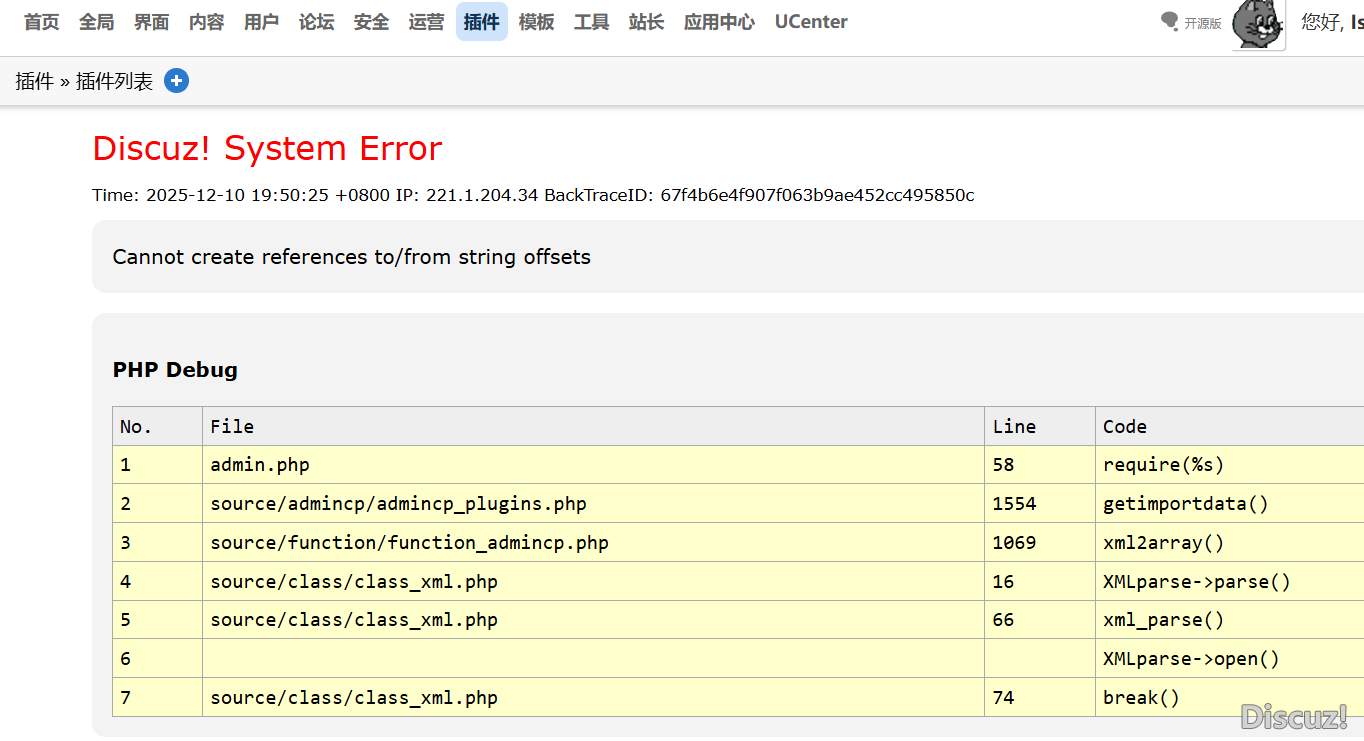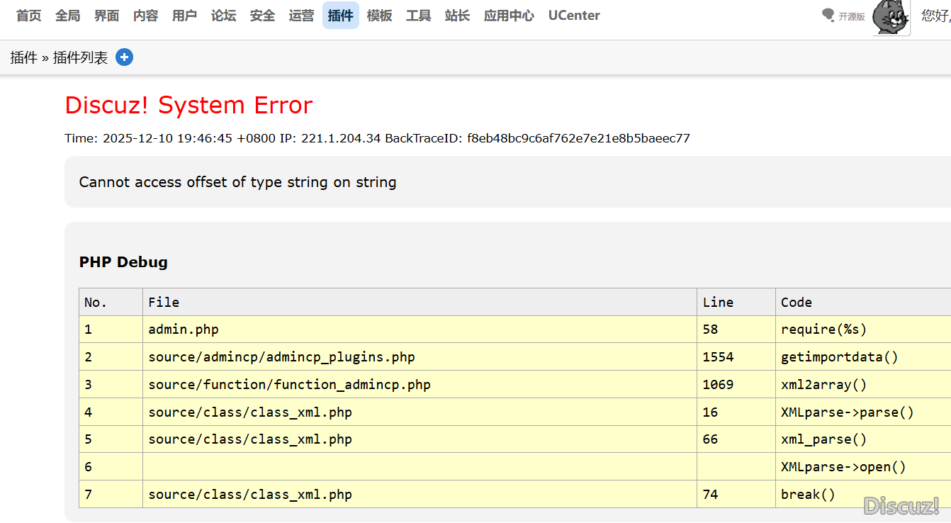 [求助] 點(diǎn)擊插件中的“發(fā)現(xiàn)新版”,報(bào)錯(cuò):Cannot access offset of type string on string |