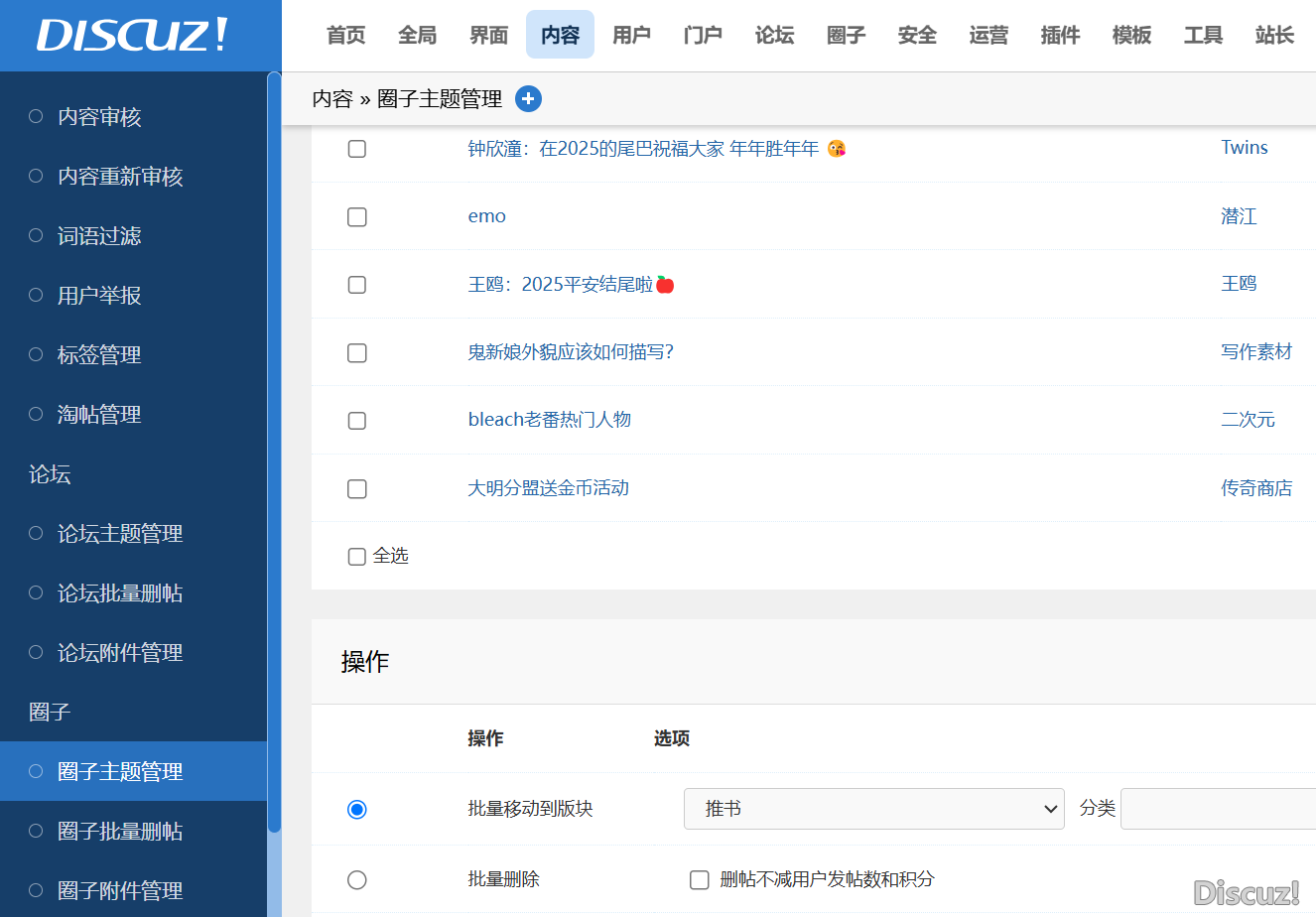 為啥后臺(tái)圈子內(nèi)容管理,帖子移動(dòng)只能是移動(dòng)到論壇去? |