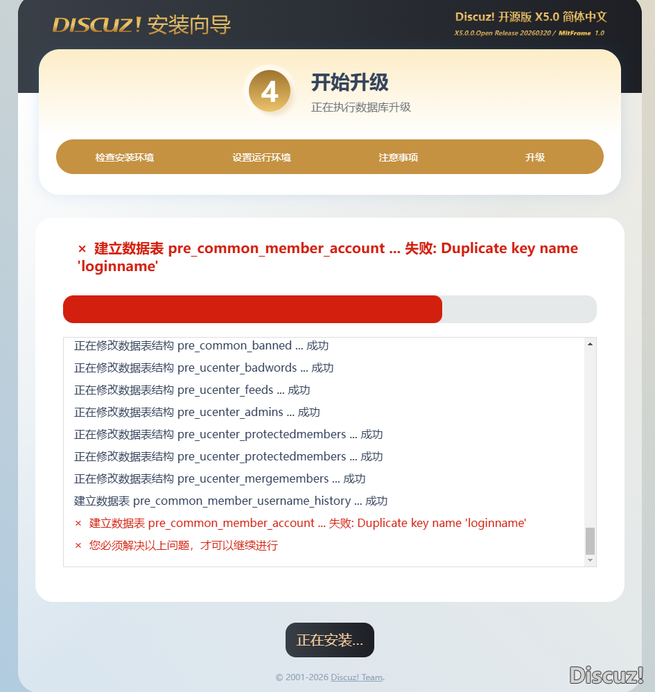 3.5版本升級到5.0版本的時候提示建立數(shù)據(jù)表失敗 |